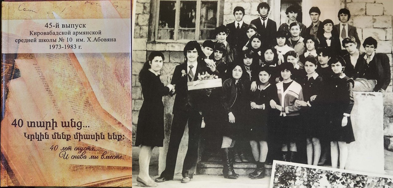 Գանձակ, 1983թ.: Խ.Աբովյանի անվան թիվ 10 հայկական միջնակարգ դպրոցի 1982-83թթ. ուստարվա շրջանավարտները: Ձախից՝ շրջանավարտման 40-ամյակին նվիրված գիրք-ալբոմի շապիկը: